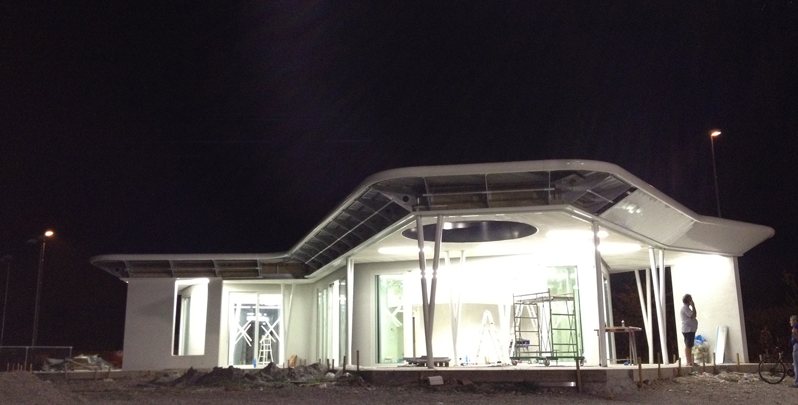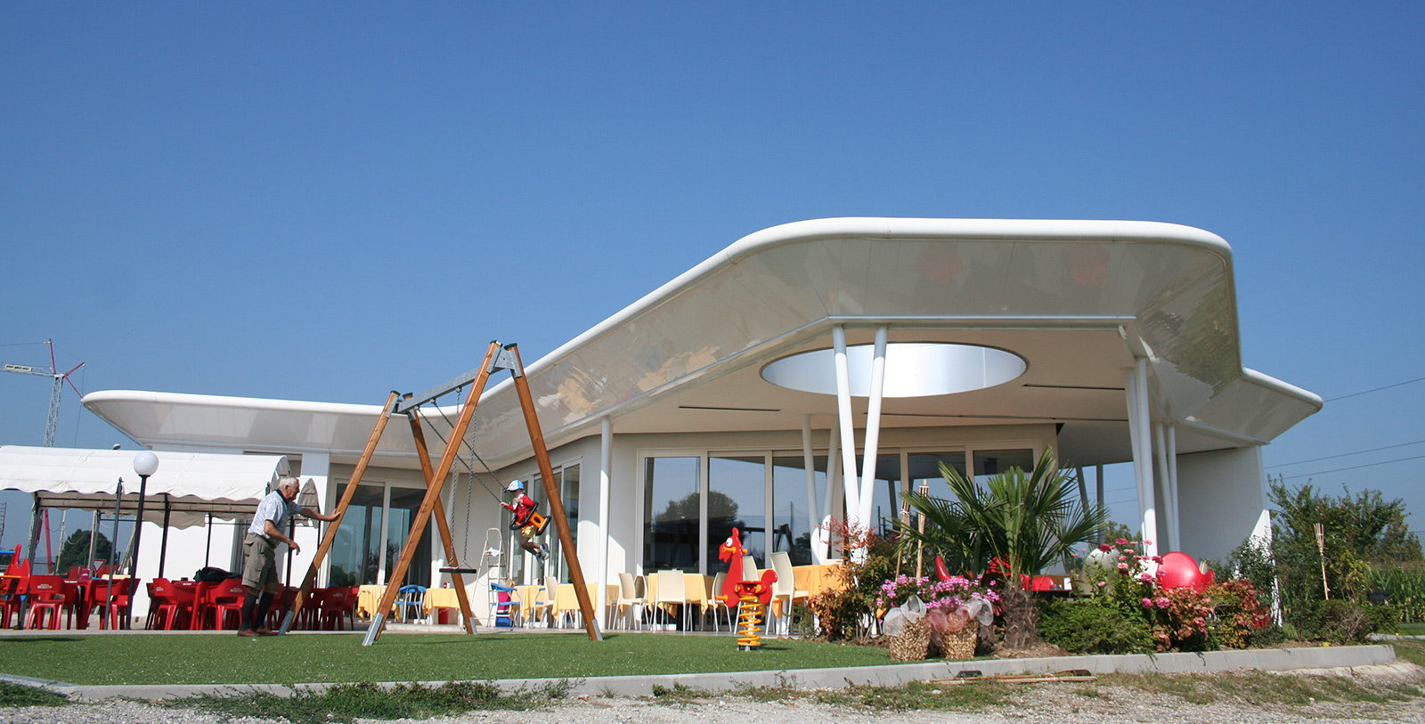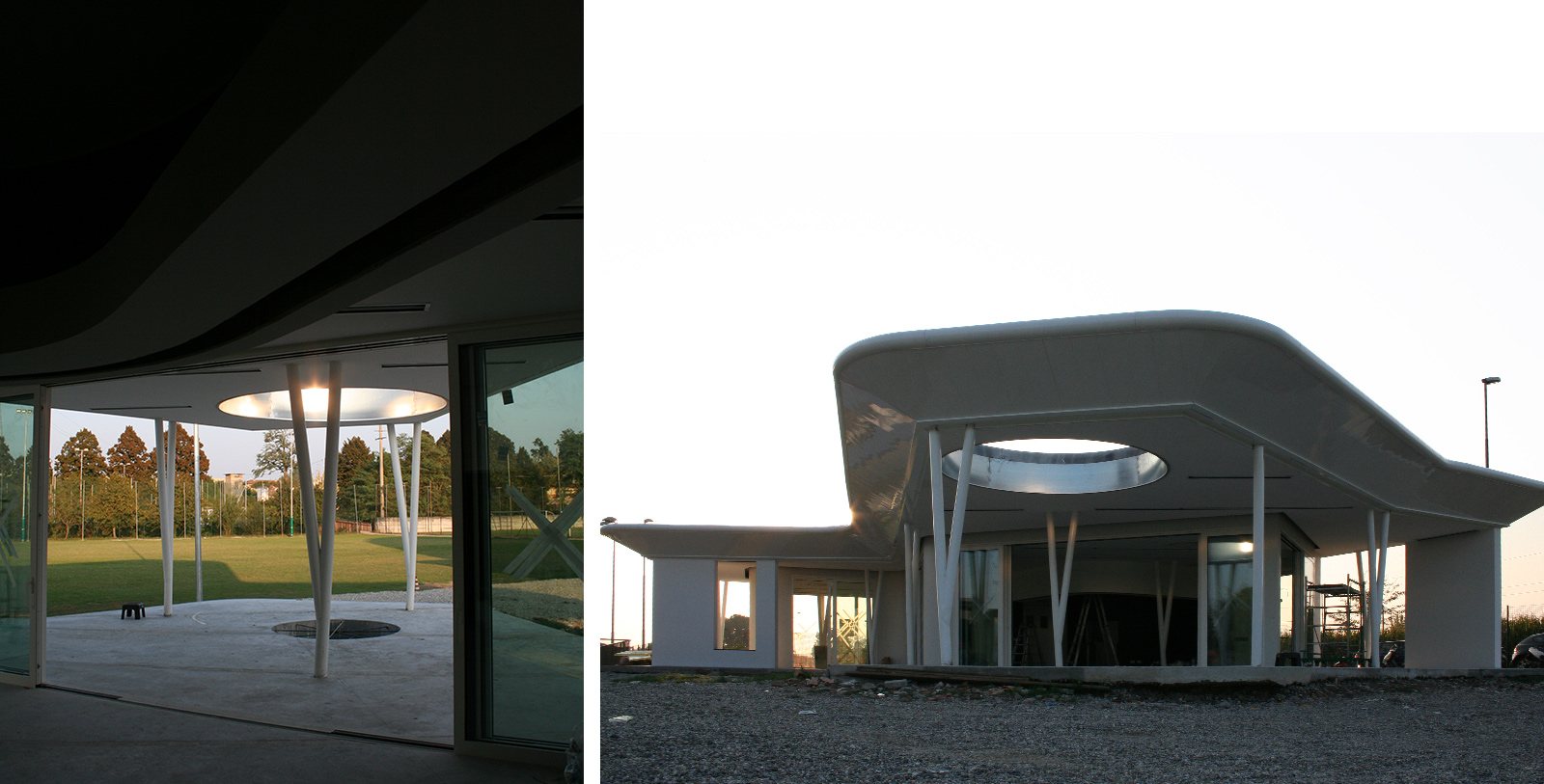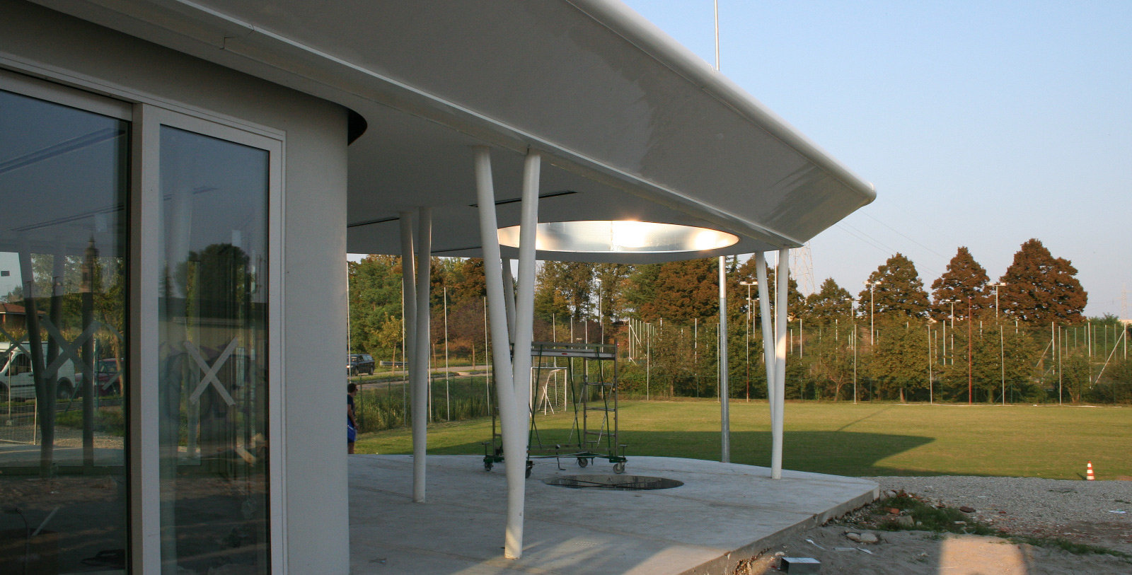 All'interno del parco cittadino, il programma ha previsto l'integrazione delle aree sportive esistenti con altri campi da gioco e la realizzazione di uno spazio in grado di ospitare nuove funzioni aperte alla città. L'esito è un edificio dotato di grande flessibilità che si espande nello spazio circostante attraverso lo scorrimento delle pareti che ne definiscono il perimetro. Il progetto ha inoltre forzato il ruolo dell'edificio attraverso una forte caratterizzazione che lo colloca nel contesto come un bianco oggetto alieno la cui grande copertura rivestita di pannelli fotovoltaici ne garantisce l'autonomia energetica.