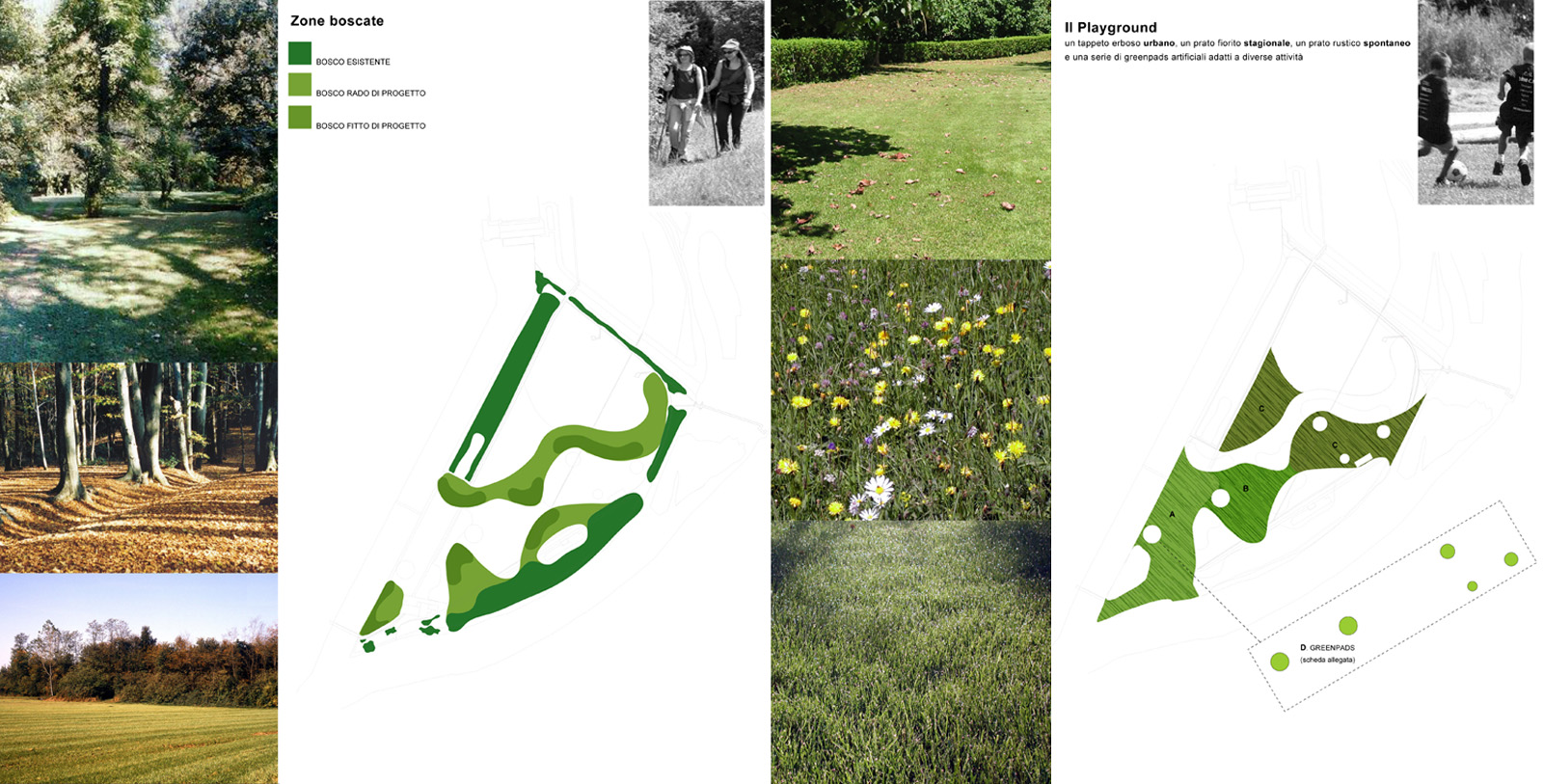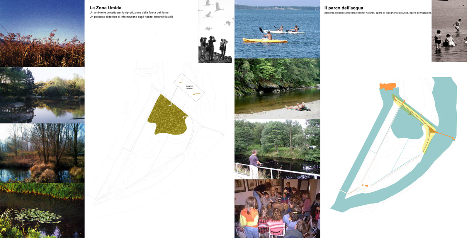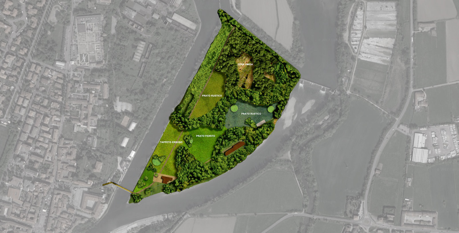 L'isola formata dalla diramazione del canale Muzza dall'Adda, ha fornito l'ambientazione ideale per la costruzione di un brano di paesaggio che ha i caratteri del parco urbano e del bosco di pianura. I percorsi che si snodano tra prati, macchie alberate, zone umide, traguardano i manufatti idraulici storici ed il centro di canottaggio, rimandando alla costante presenza del fiume.
