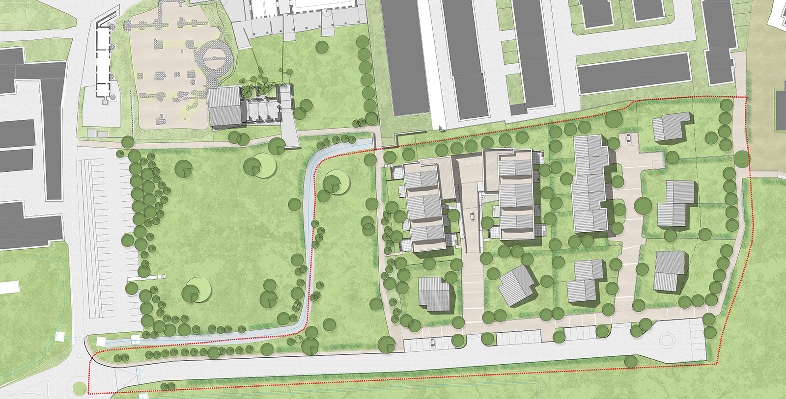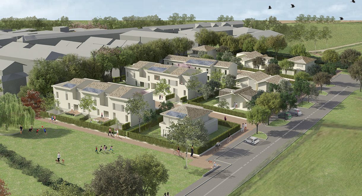 Il nuovo tessuto residenziale si colloca ai margini della città ma trova una significativa centralità attraverso la viabilità lenta e la dotazione di un parco integrato nel polo archeologico di Laus Pompeia. L'edificato costruisce un nuovo fronte urbano che media con densità decrescenti ed ampie aree e filtri verdi il rapporto tra città e la campagna circostante.