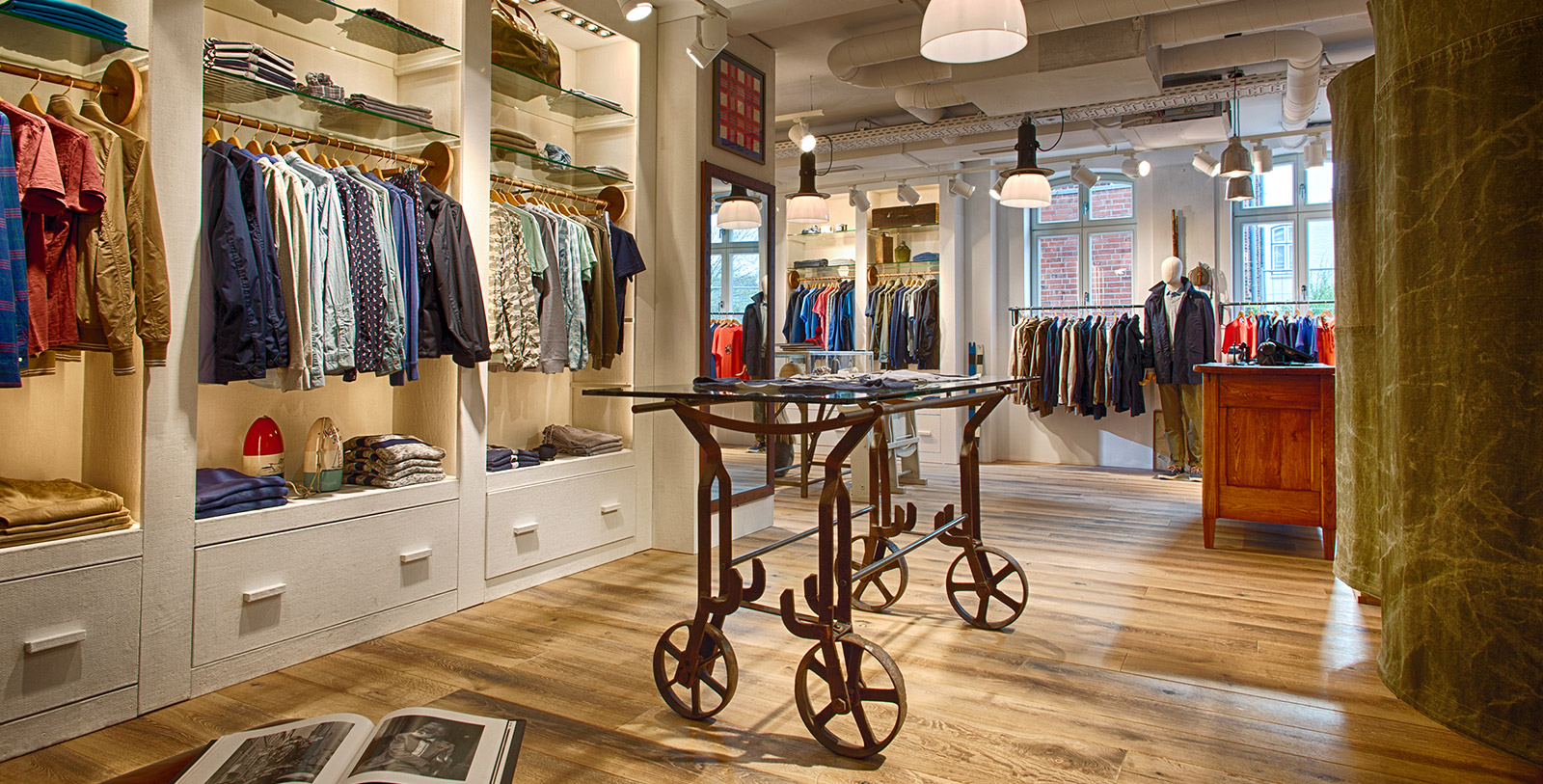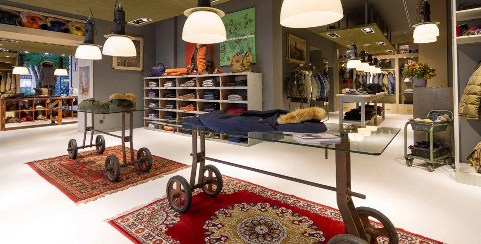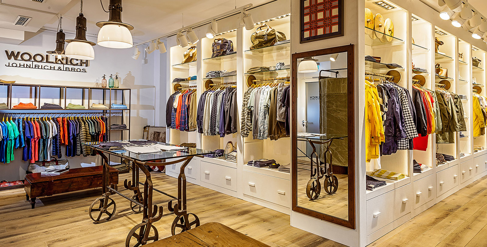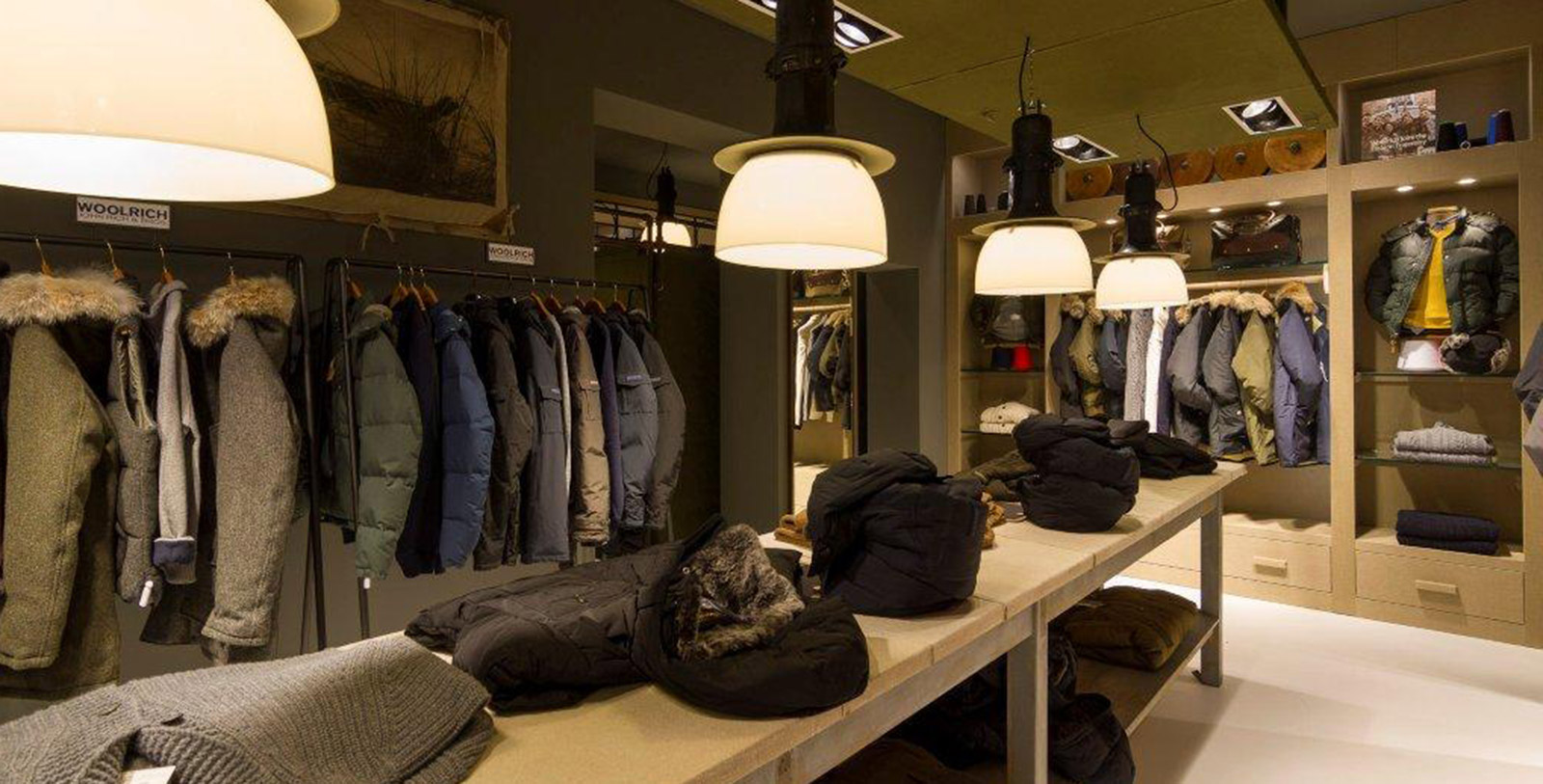 The refined research of both contemporary and historical material, colours, lights and furnishings, value the Woolrich design, interpreting the early days of the product and the strong brand identity within the functional exposition area.